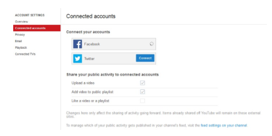 - You can connect your YouTube channel to your Facebook and Twitter profiles. This is used to create statuses on your social media accounts every time you upload a video, like a video or edit your playlist. Be sure to click save once you’re finished!