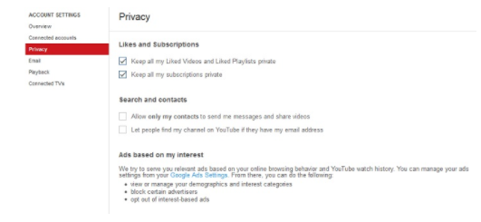 - On this page, you can make certain actions private. This includes options like your subscriptions or liked videos and playlists. You can even edit settings regarding how people can contact you on YouTube.